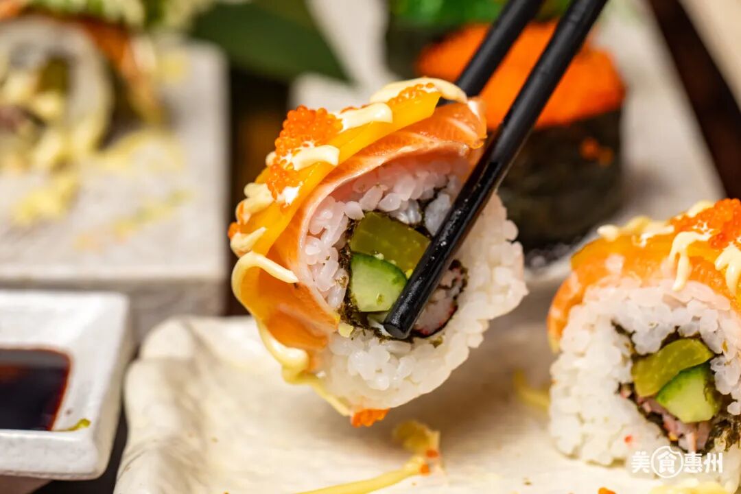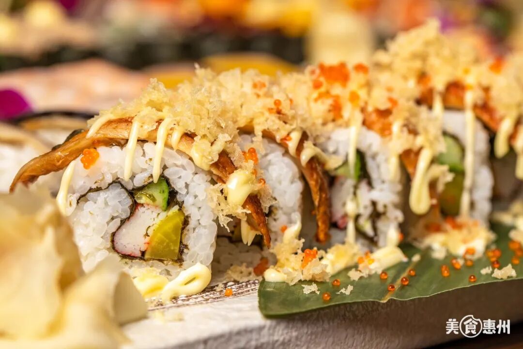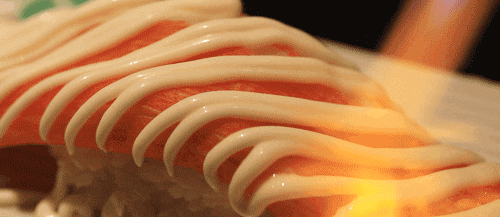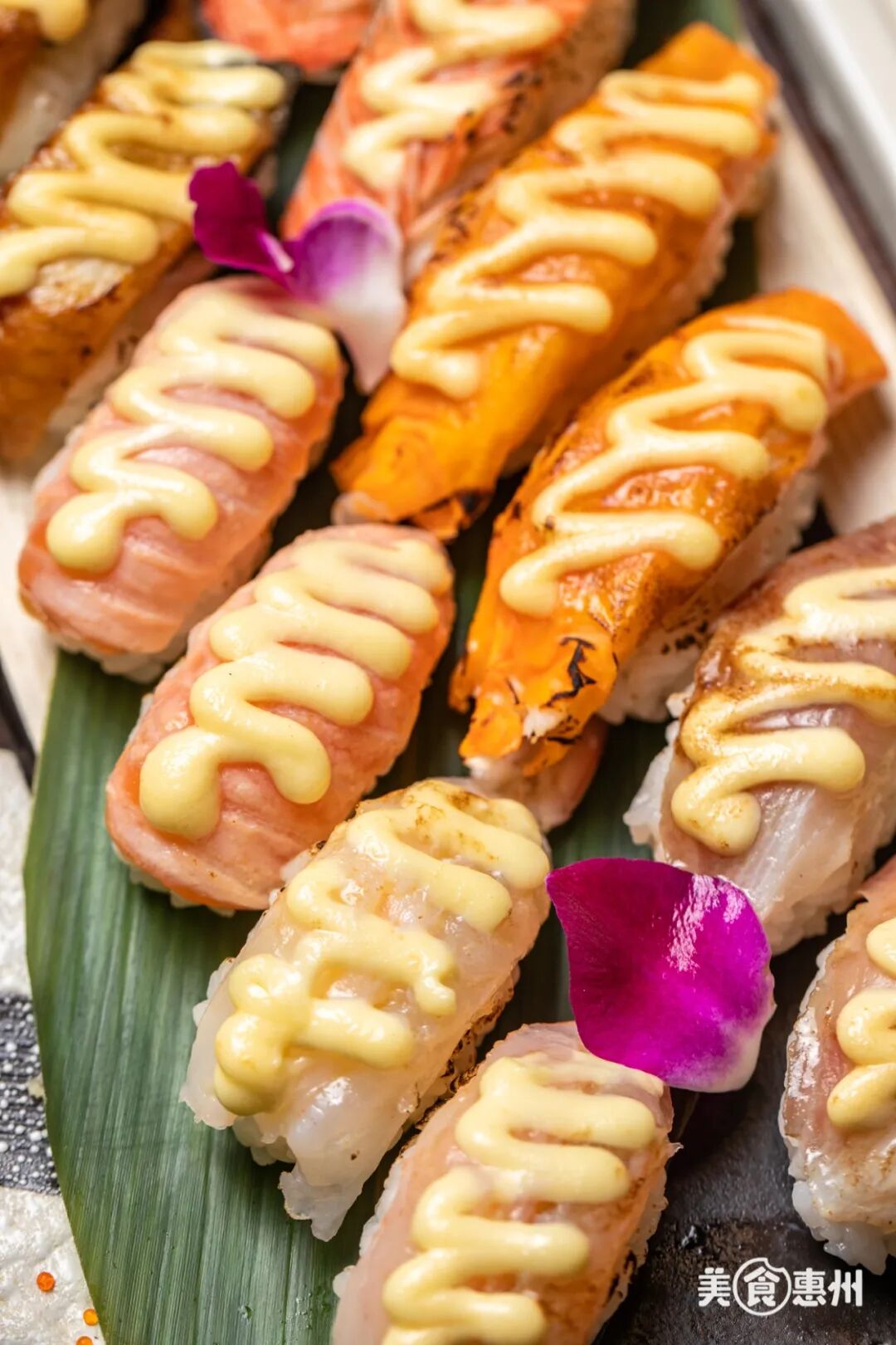 每次来,一定会先把火炙系列都点一遍!淋满酱料的巨型蟹棒寿司,在高温喷枪猛火加热下,芝士和食材完美融合闻着那阵阵浓郁的焦香味,让人垂涎欲滴。