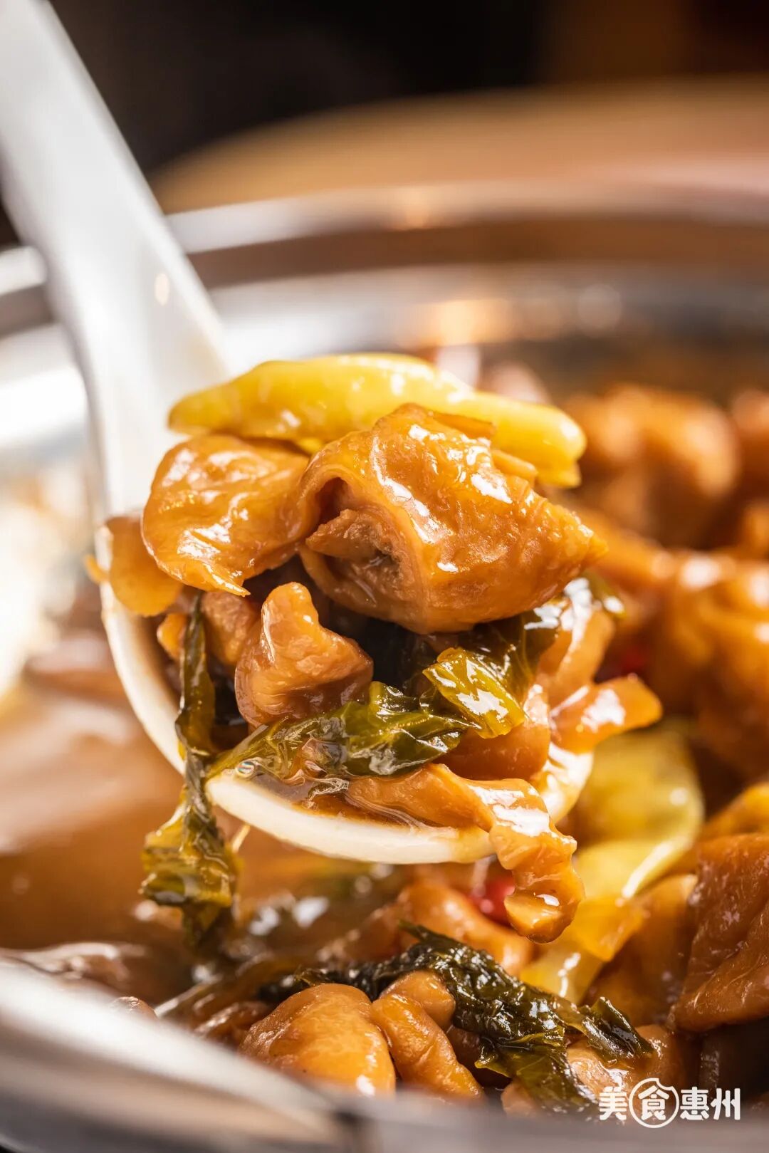 大肠处理得十分干净,用新鲜熬制的高汤吊煮,完全没有异味。酸菜的酸正好把肥肠的油腻都舒解掉了,弹韧的口感中油脂不经意间扑上舌尖,越嚼越香!