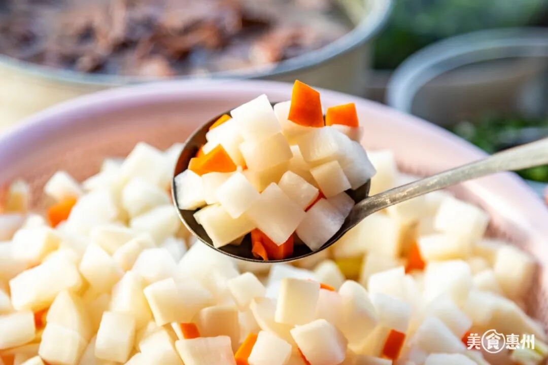 与大多数放炸黄豆粒的麻辣烫店不同,路转粉放的是自己腌制的酸萝卜丁。老板说这些酸萝卜足足需要腌上48小时。