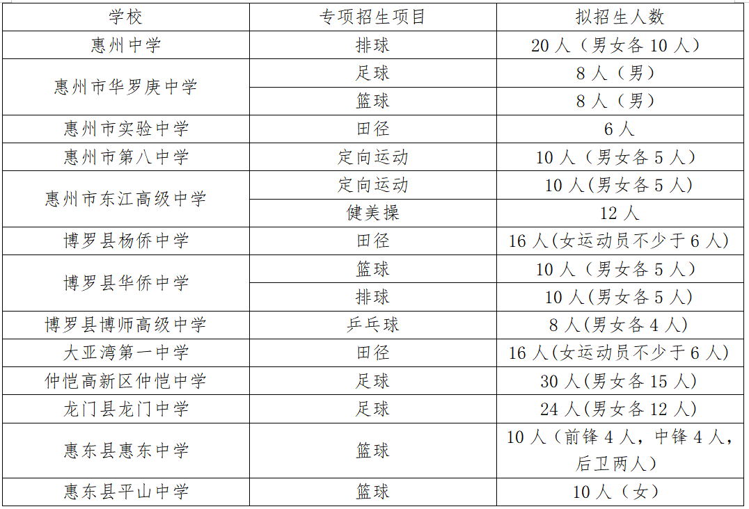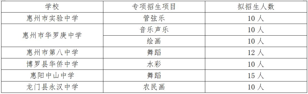 此外,惠州中学还将招收音乐特长生18人、美术特长生18人、排球专项生20人,男女各10人。