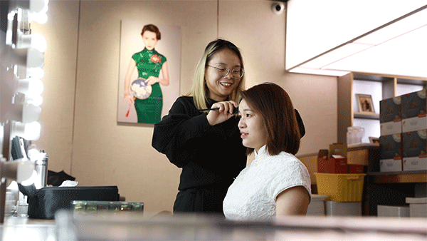 选好服装,就到了最花时间的妆容设计了。化妆师会把顾客的需求放在第一位,再根据不同的面部特征和肤质肤色,为每位顾客定制妆容~