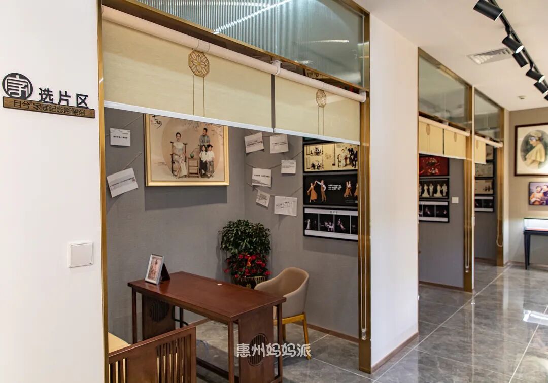 摄影馆内的装潢风格以新中式主,店内的细节无不凸显出高级感和精致感,清新的原木色搭配温暖的灯光,设计感十足的隔断,整洁干净的服饰摆放,时时刻刻让你处在被温情优雅包裹的气氛中