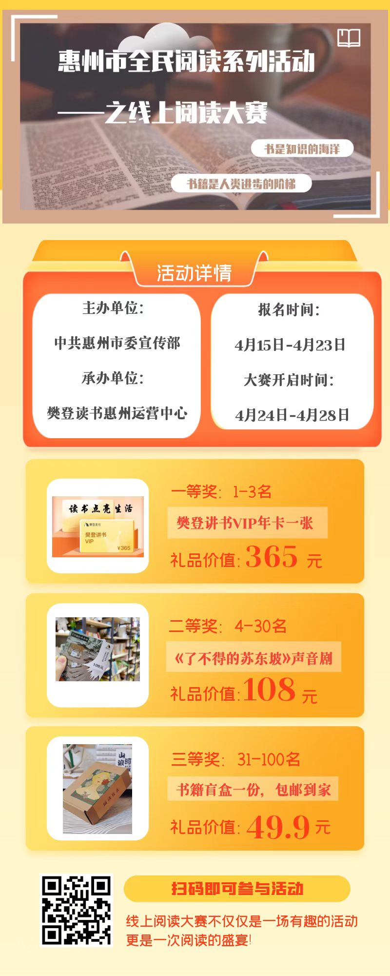 又到一年读书日。今年,惠州打破以往由政府主导读书节的模式,采取“政府+企业”共同参与的形式,推动有关部门、本地企业、知识社群、网红书店共同推出了一系列线上线下阅读活动,广邀市民畅游书海,感受书香魅力。