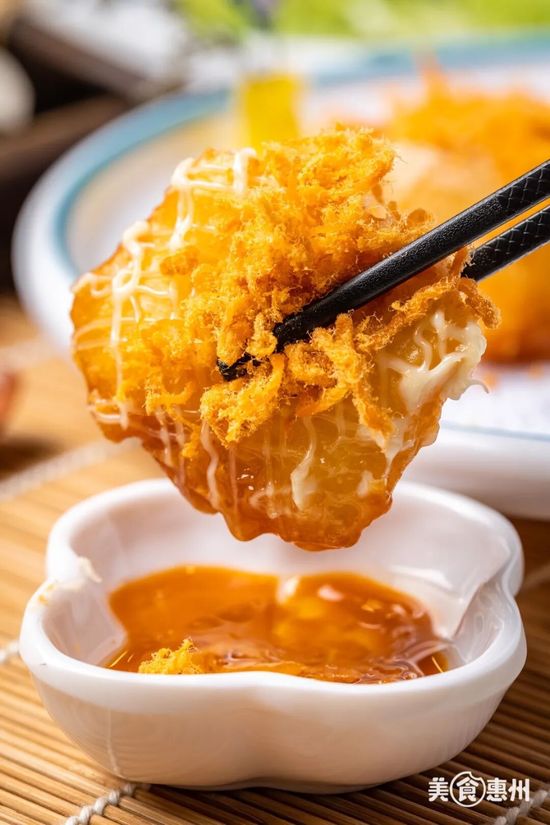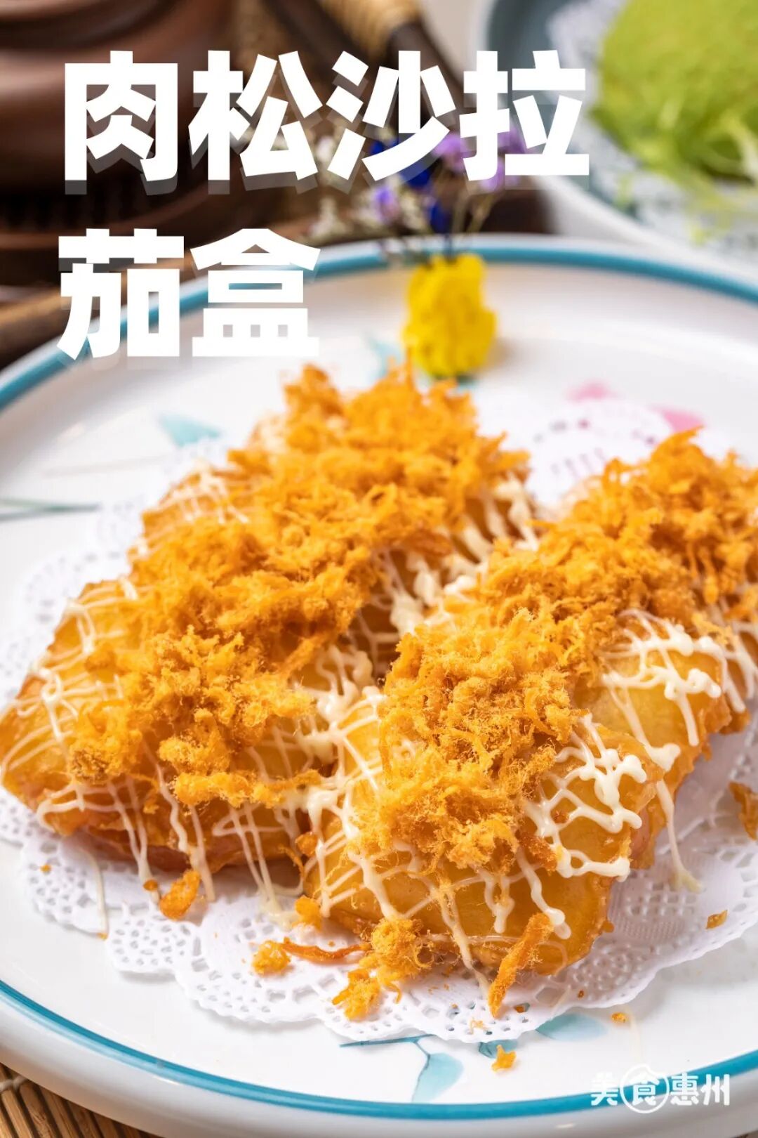 酥脆的外皮上淋满了沙拉酱、放满了肉松,内里是软滑的茄子肉。一口咬下,多重口感交织于舌尖之上,这是给味蕾送上的巧妙惊喜。