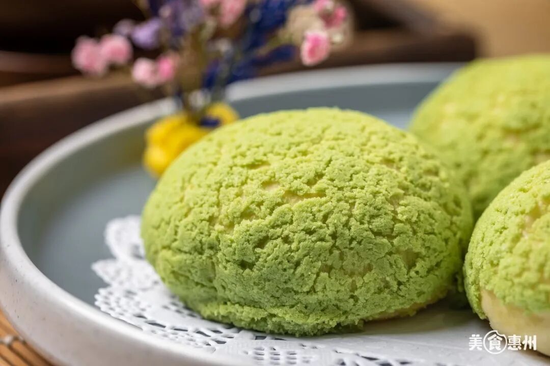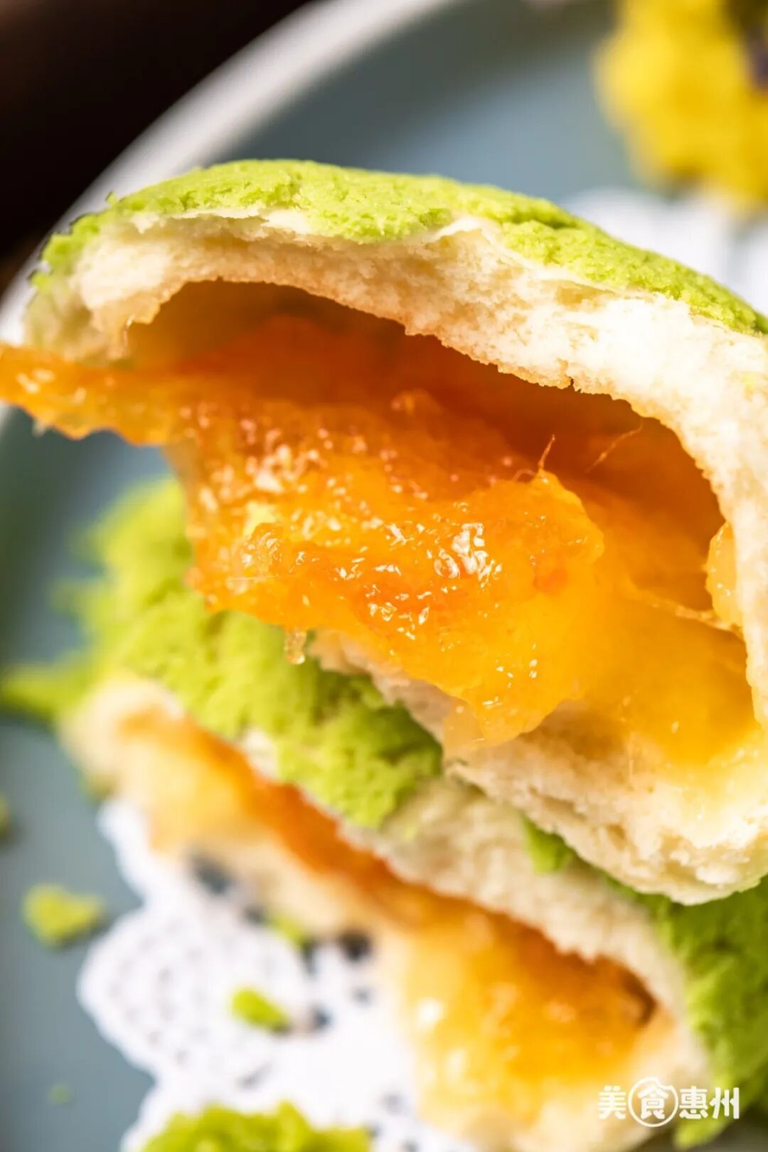 话点就点巧妙运用菠菜汁制作了一个草绿色的酥皮。酥皮下是软糯的包子皮,发酵到位,口感好的皮轻轻按压还会回弹呢!
