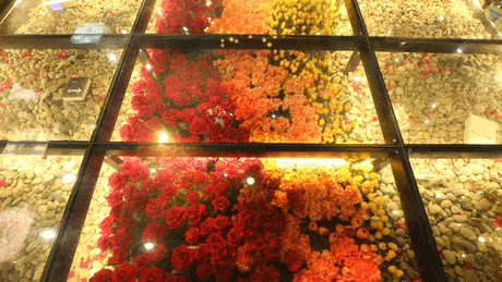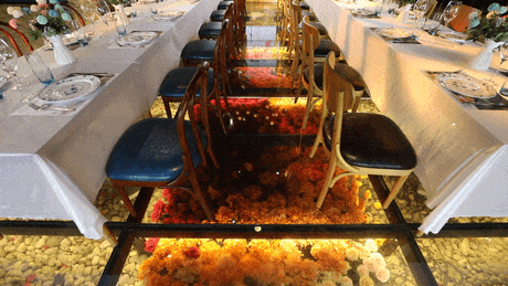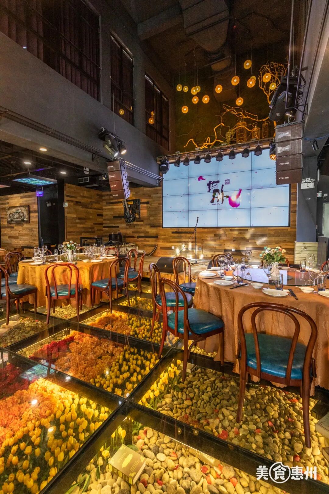 最值得一提的是,大厅中央的地板细节满分,透明玻璃下簇拥着的鹅卵石块和鲜花点缀,宛如置身一片花海,舞台上的LED荧幕一亮起,氛围十足,很适合打造成浪漫的求婚现场~