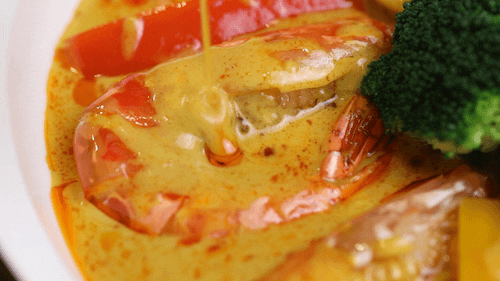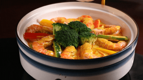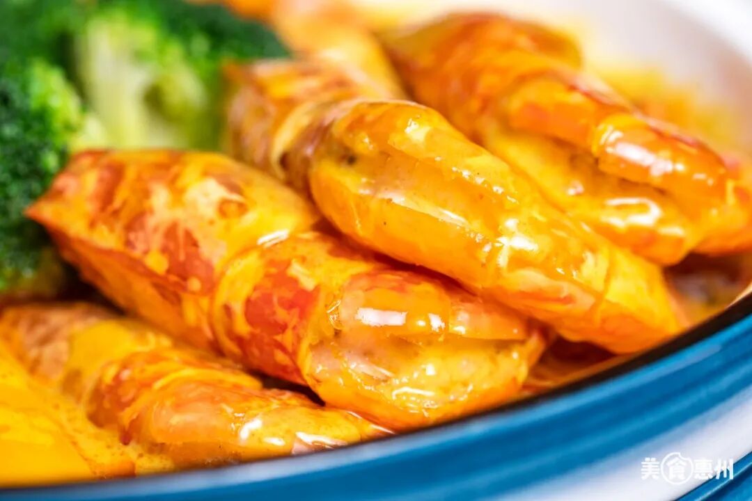 肉嫩鲜甜的九节虾,每一只个头又肥又大,厨师们贴心的开好边,虾壳轻轻一掰就脱壳,非常方便。虾肉紧实嫩滑,咬下去满口浓郁的咖喱味和大海的新鲜味。