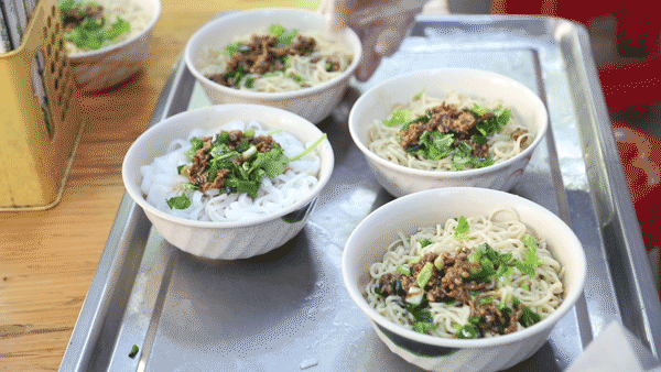 阿姨将一碗热乎乎香喷喷的拌面端上桌