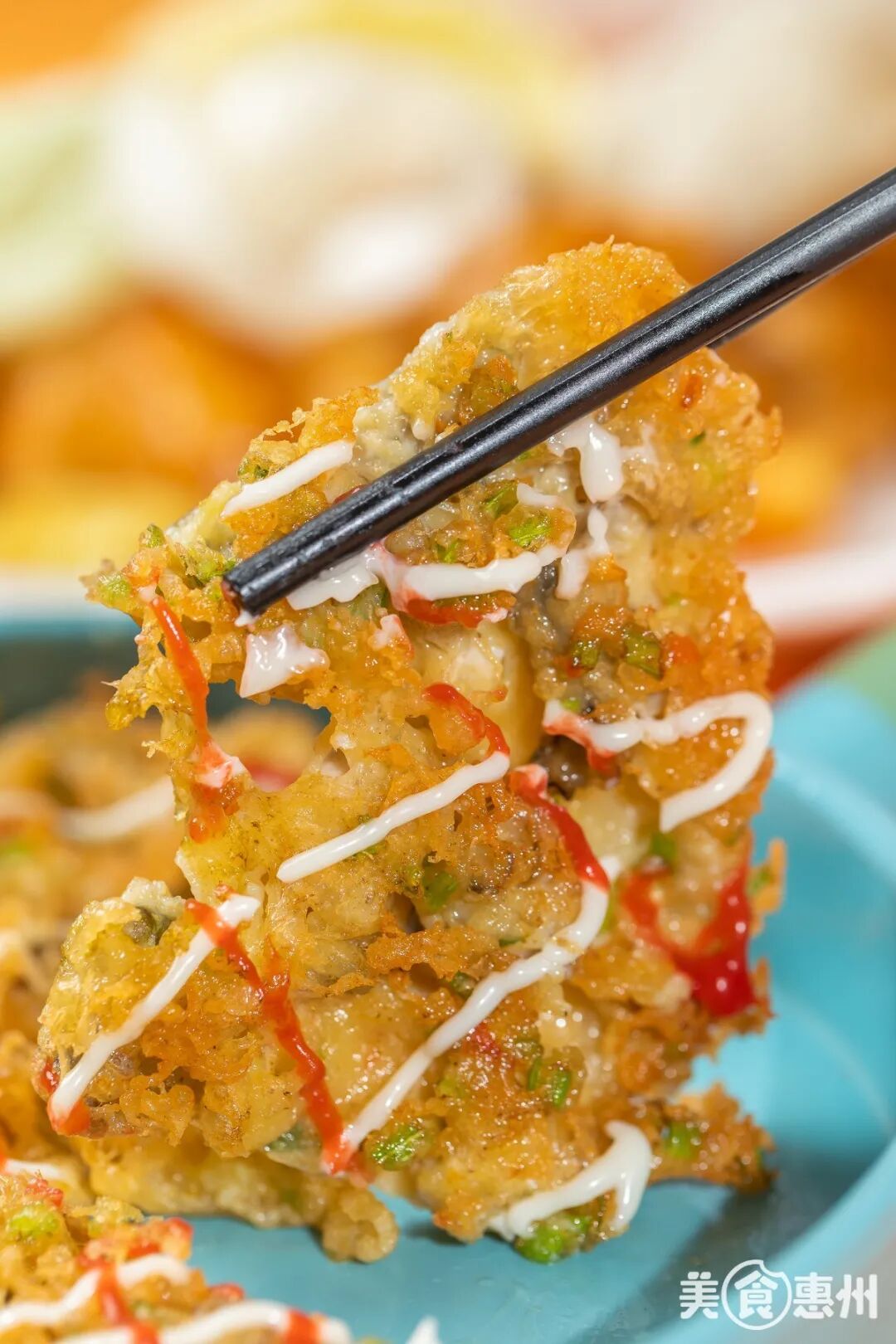 蚝烙焦黄中杂夹着青翠的芹菜和洁白的蚝肉,挤上沙拉酱与番茄酱后更是色彩丰富,看着就令人胃口大开。