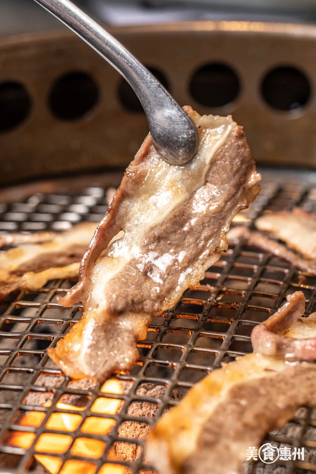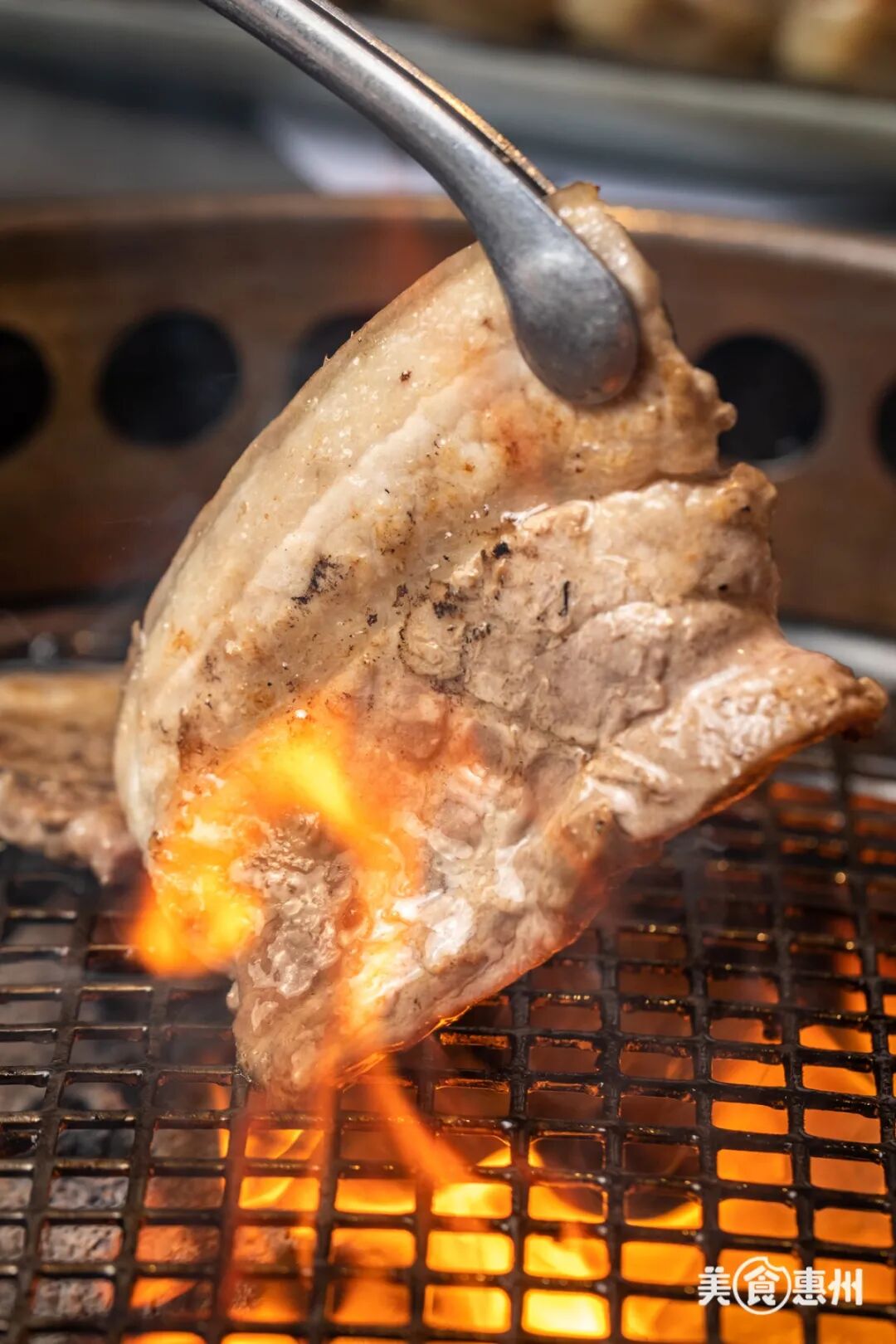 店内的厚切猪五花分量十分实在,厚厚一块在烤架上格外有存在感。带着皮的五花肉肌理分明且带着纹路、红白相间,口感出众。