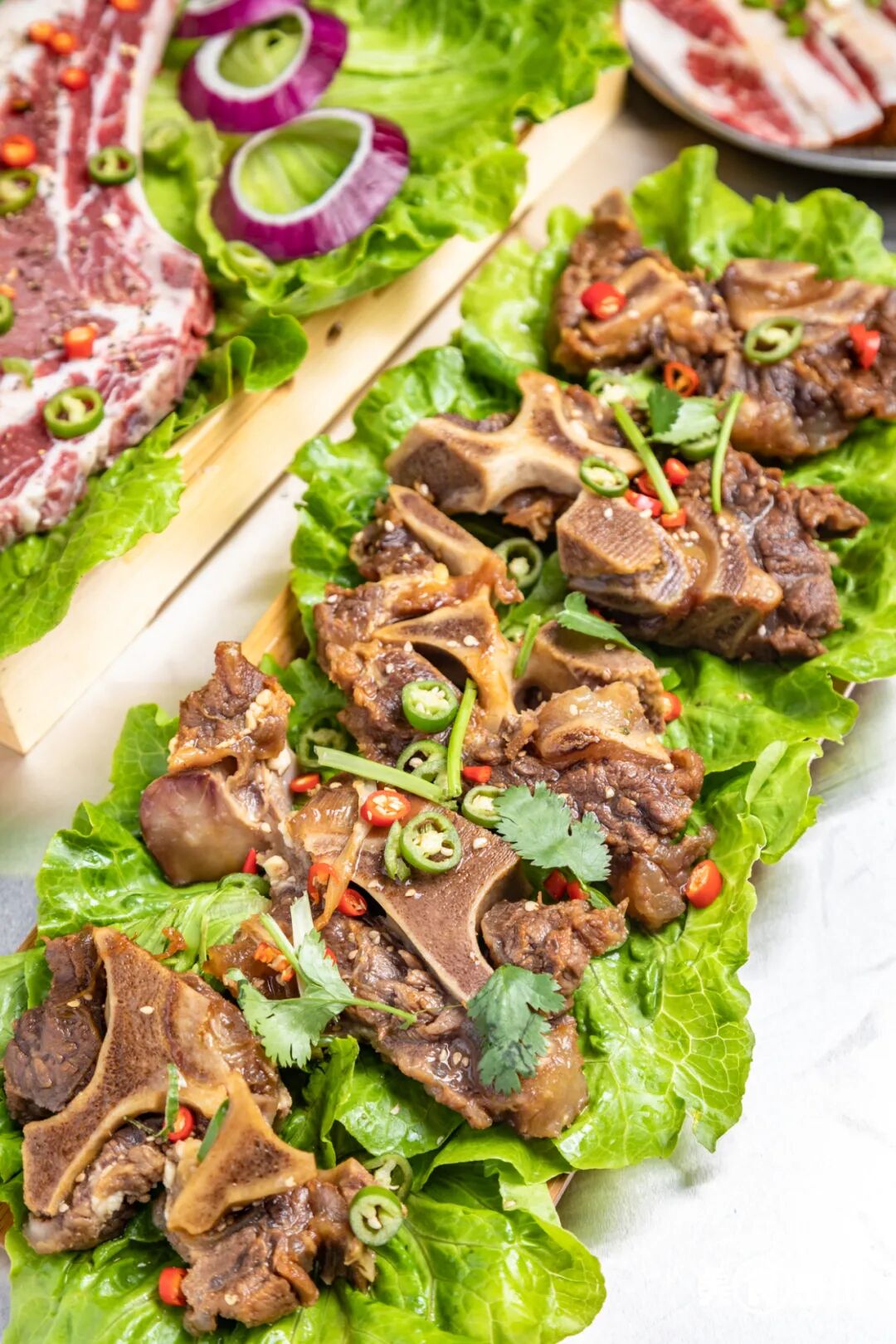 别看这么一大块骨头,边上的牛肉分量并不少,撒上香菜、辣椒、芝麻,放到烤网上烤个两三分钟就可以开吃!