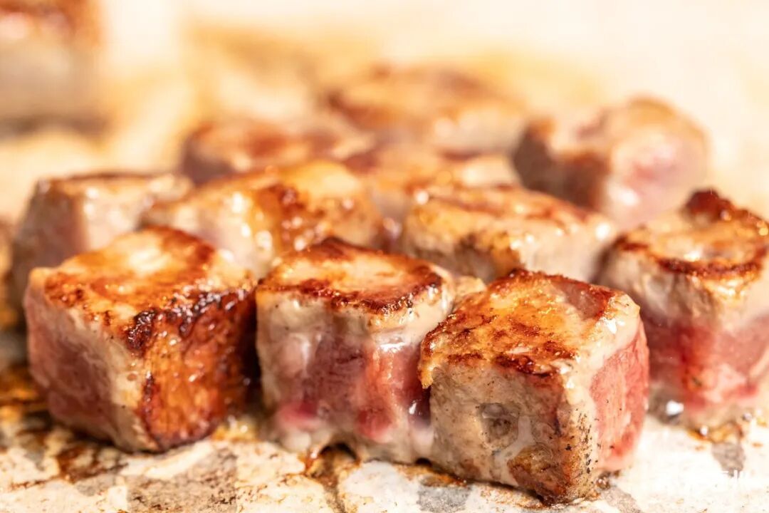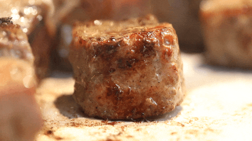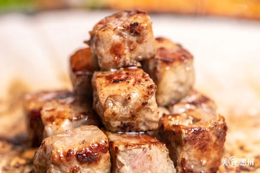 温度与时间造就了牛肉粒的成色和口感,经过高温的烤制过程后渐渐散发出香气,在似焦未焦之时口感丰腴,更加满足。