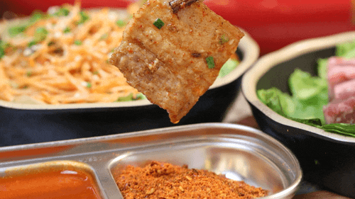 五花肉腌制后本身就有辣味,蘸上辣椒面后会更加火辣够劲,不太能吃辣的朋友注意不能一次蘸太多啦。不喜欢辣的朋友也不怕,蘸上甜丝丝的湿酱中和辣味,酸中带甜,十分清新。