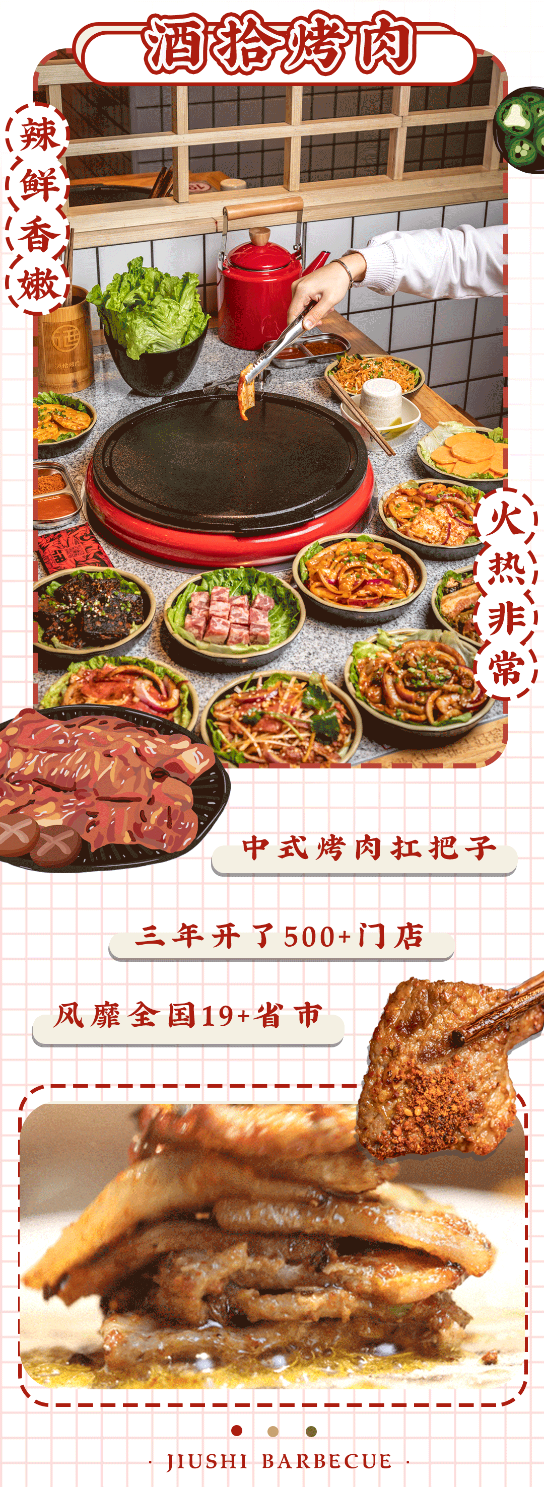 酒拾不仅在其品牌发源地长沙大受欢迎,得到了本地人的喜爱与支持,同时引爆了全国各地对于中式烤肉的热情。在3年内,全国各地开了500+门店,还好评如潮,所到之处大排长龙,人气超高!