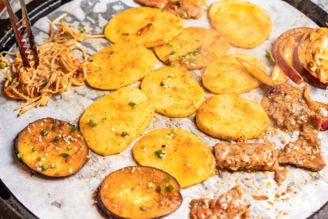 蔬菜都提前腌制过,尤其入味,在烤炉上不一会就发出阵阵香气,令人食指大动。金针菇爽口、茄子软糯,我最爱的是这土豆,烤制后外层酥脆有韧性,咬开后内里却很绵软,口感层次丰富。