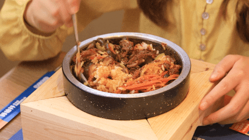 加入拌饭酱,将食材都均匀搅拌开来后便可以开吃。不同的蔬菜与米饭在石锅中加热,诱人的色泽,会让挑食的你吃到见底。