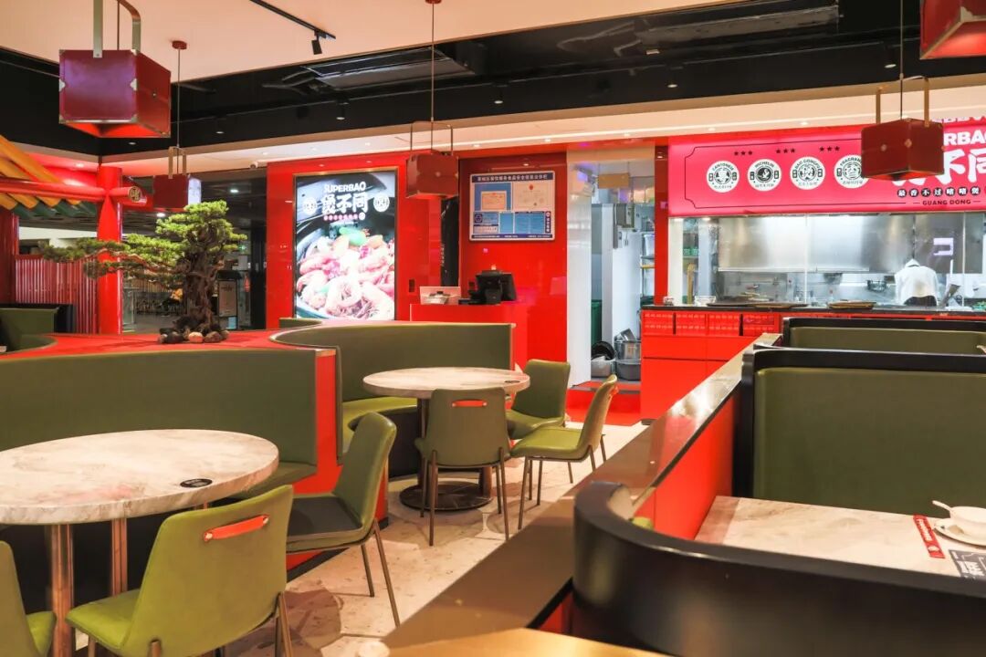 宽敞明亮的用餐环境,用红黄绿三色打造出一个极具复古国潮风的氛围。看着半开放式厨房里师傅们忙碌的身影,那份属于广东的烟火气,在这体现得淋漓尽致。