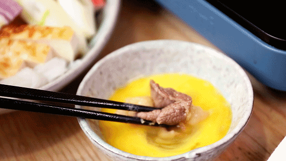 将鸡蛋打入碗内搅匀开来,再将煮熟的牛肉蘸上蛋液后即可食用。温热醇厚的肥牛蘸上无菌蛋液是日式牛肉寿喜锅的精髓,降低牛肉温度的同时还增添了几分嫩滑。