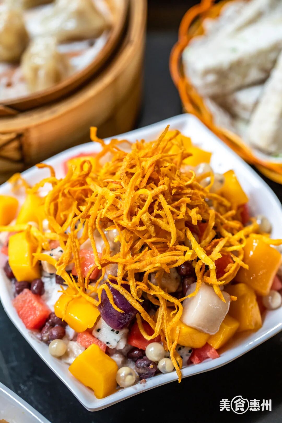 这里还有一个秘密武器,番薯丝,炸的香酥脆,吃起来嘎嘣响,搭配冰沙,丰富了口感,一下能体验到多重感觉,越吃越香,真想买上一大包带走。