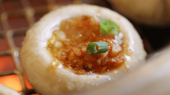 在炭炉的高温下,口蘑的水分被逼出,蒜香味弥漫在空气中,烤到微微发黑的时候就可以了,一口吃进去外酥里嫩,鲜嫩多汁,提醒一句~小心被汁水烫到哦!