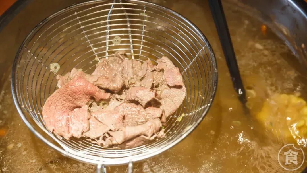 把肉浆做成丸状后要立马下锅煮,用熬够6小时的牛骨汤底熬煮牛肉丸,小火煮8分钟,煮熟就要捞出,每一颗都会爆汁还超级弹牙!