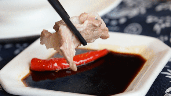 还可以将猪肉蘸上「天甄」特制的酱料食用,酱油加小米辣,味道更佳。