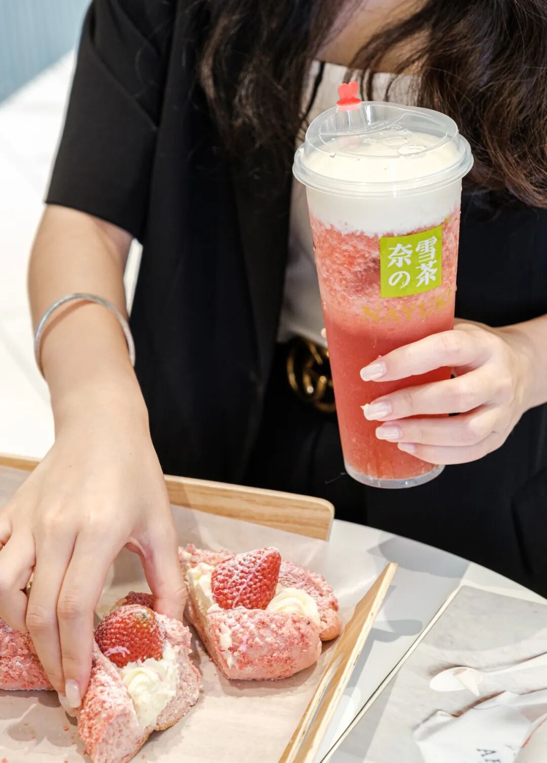 「霸气芝士草莓 + 草莓魔法棒」双重的粉红爆炸,美好到让人舍不得吃掉。新鲜草莓与茉莉毛尖撞击出了奇妙的味觉体验,混合醇厚的芝士,实在是完美。