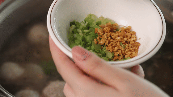 碗内加些许芹菜末或炸蒜末后盛汤