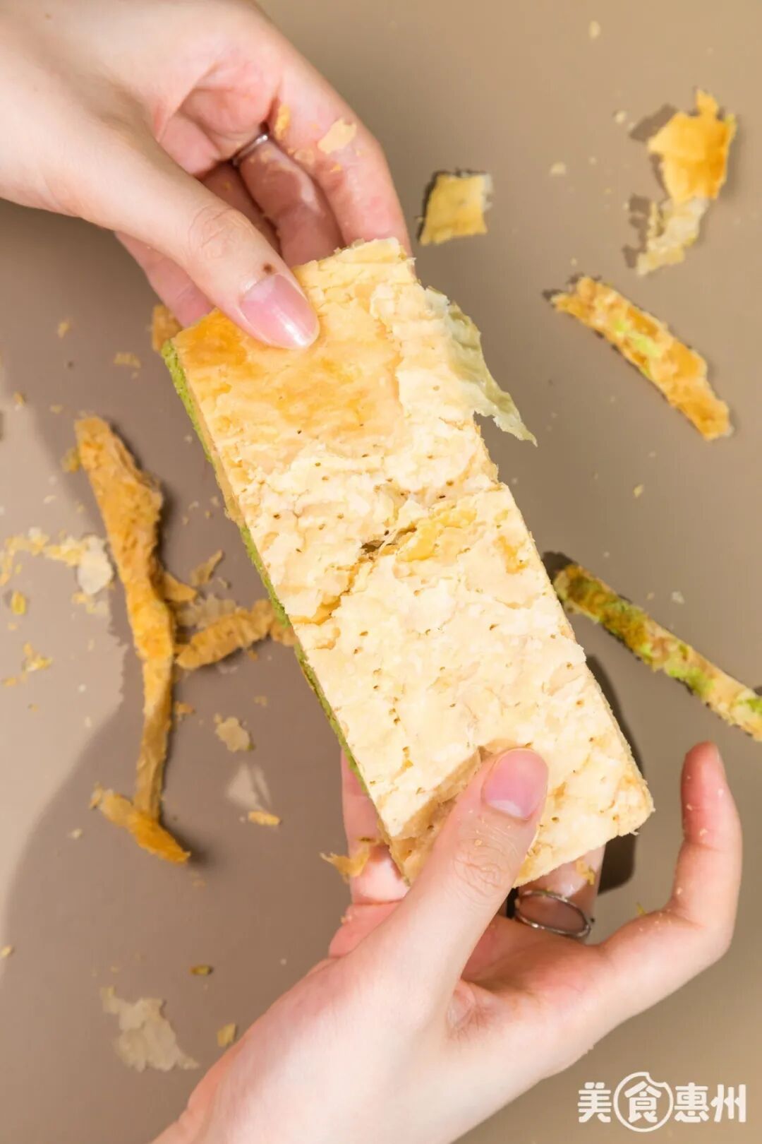 酥皮之间的夹层口感绵密,带有抹茶的香味