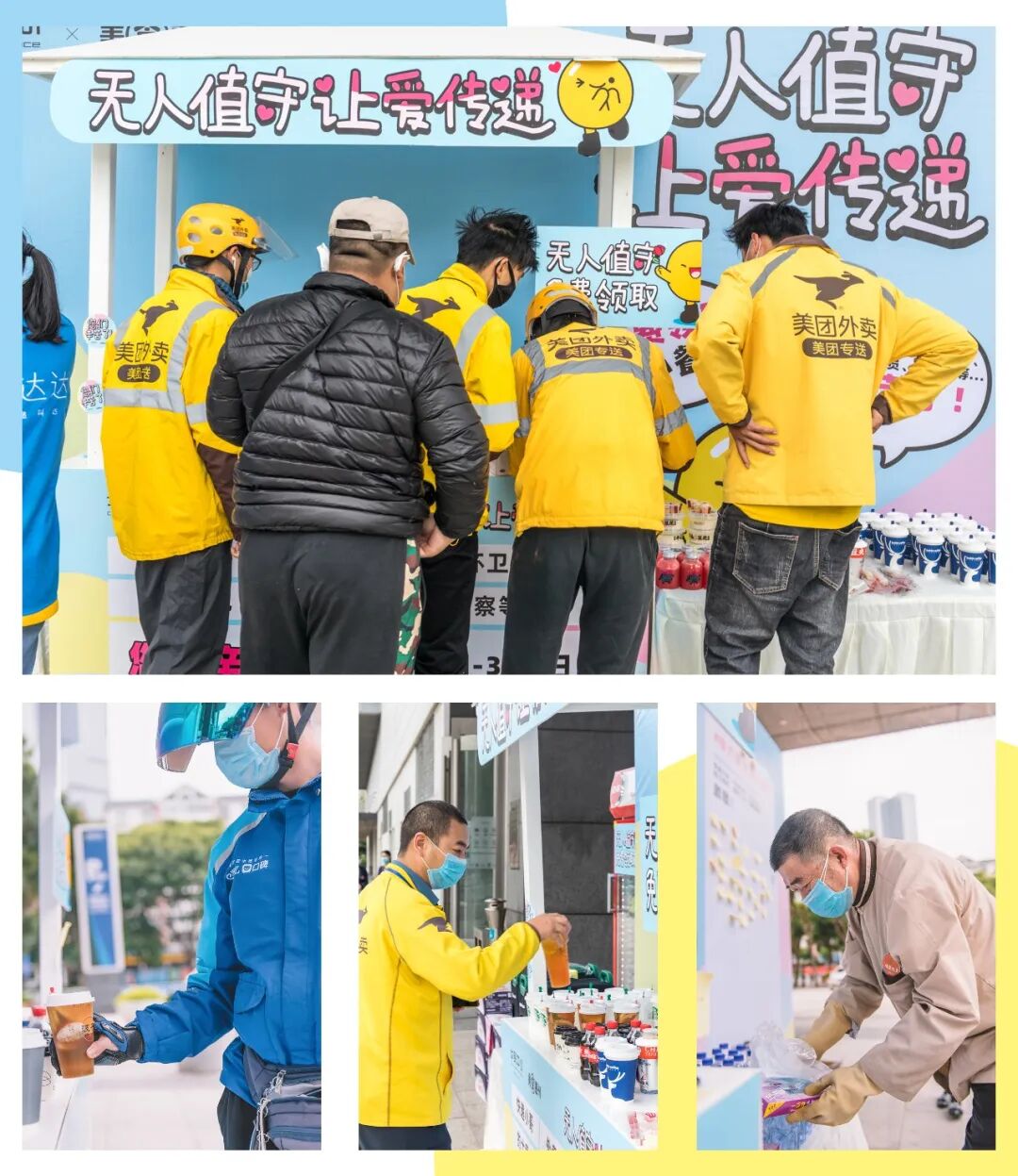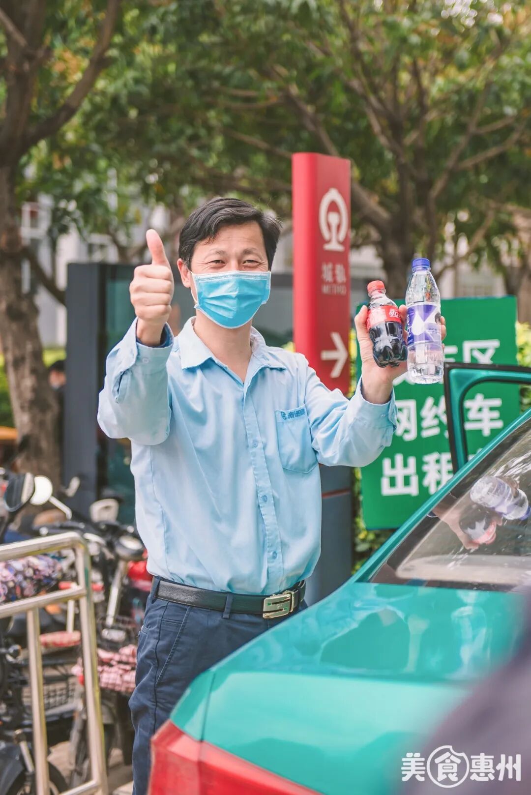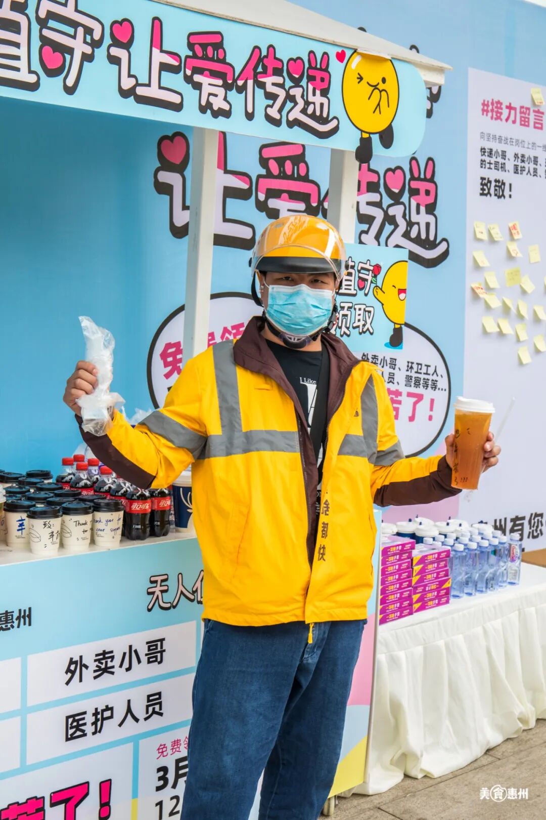 非常时期在坚持跑单的的哥们,因为交通问题不方便下车,我们的工作人员给他们递了可乐和矿泉水,希望他们及时补充能量。