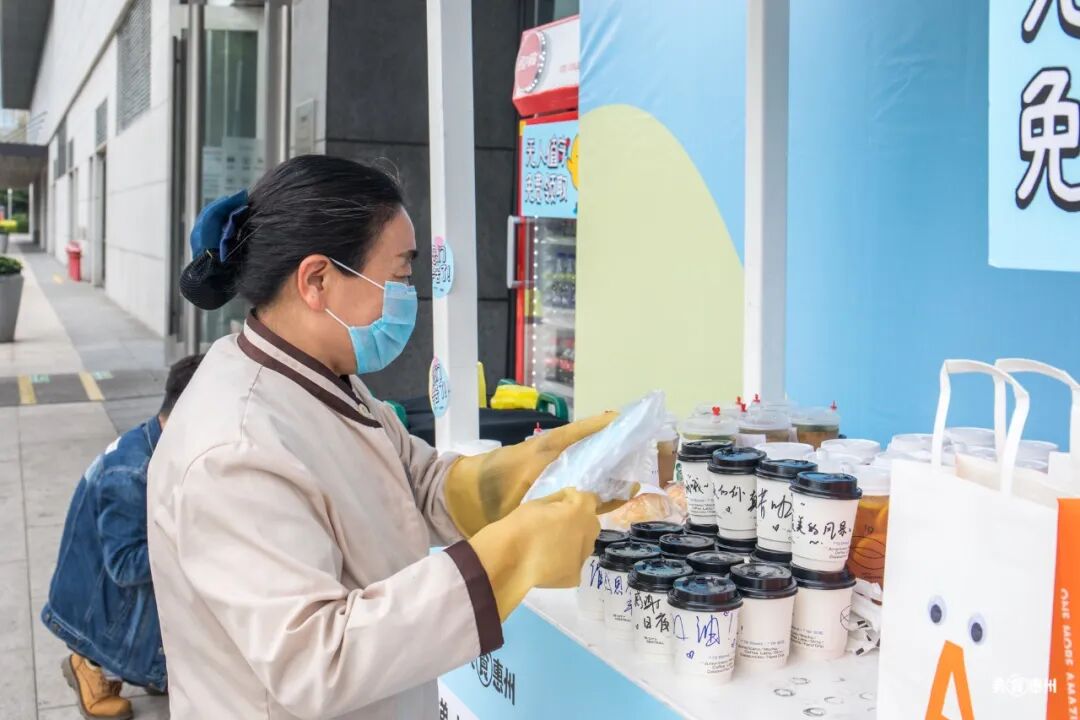 保洁阿姨走近端详,但只拿了一个口罩。她说自己就是有点累了过来看看,还没有很渴,吃的喝的给年轻人多留一点吧。