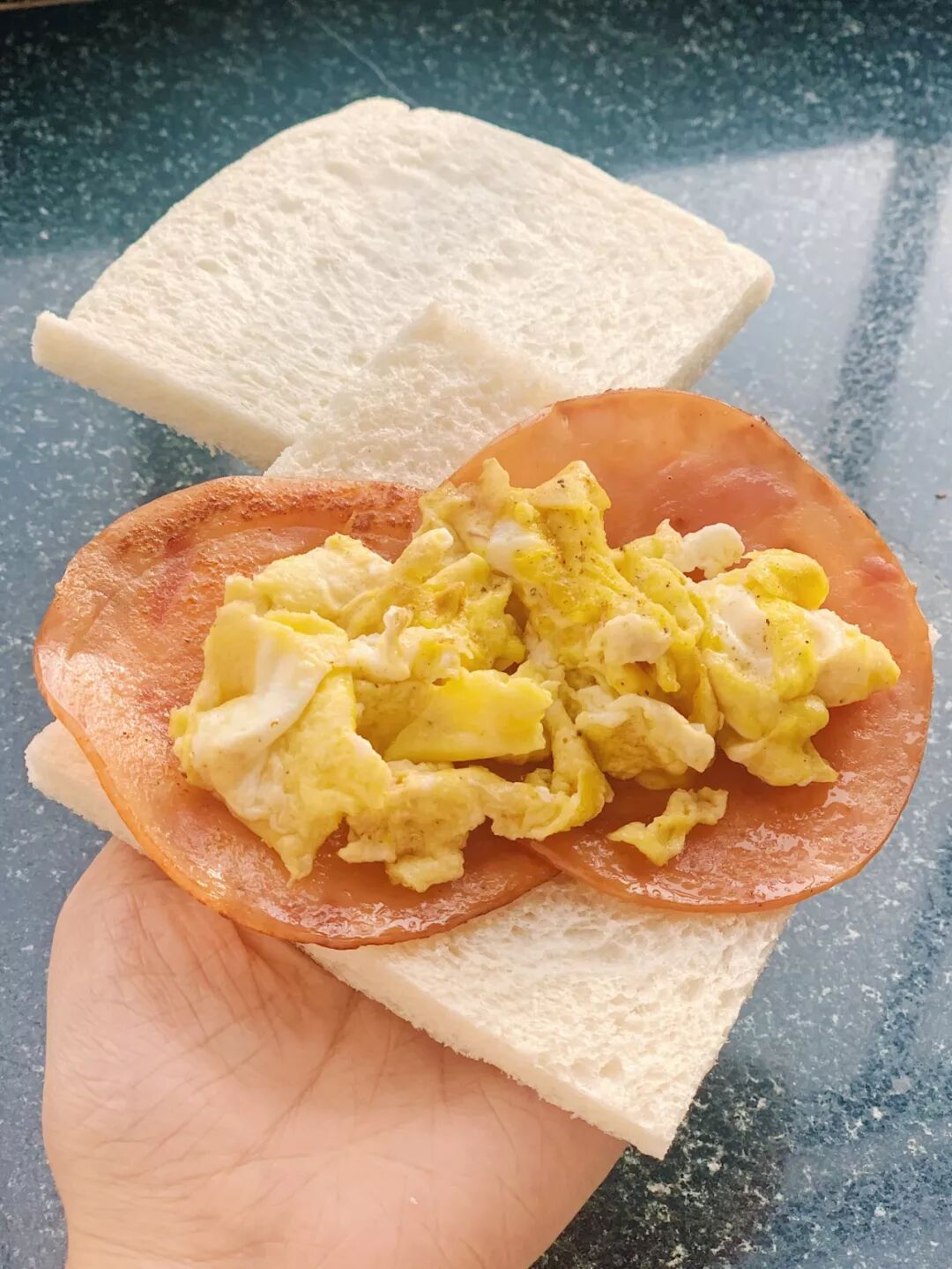 鸡蛋又滑又嫩,夹在火腿片里吃美味极了
