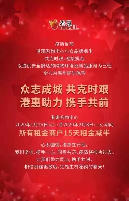 各行业在采取应急措施的同时,小编也收到了来自这些商家的新春温暖。目前惠州已有三家商业体发布减免租金的通知: