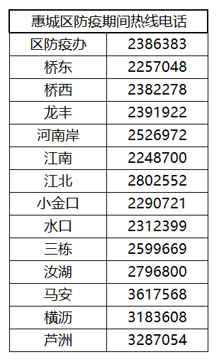 惠城区各镇街防疫期间热线电话: