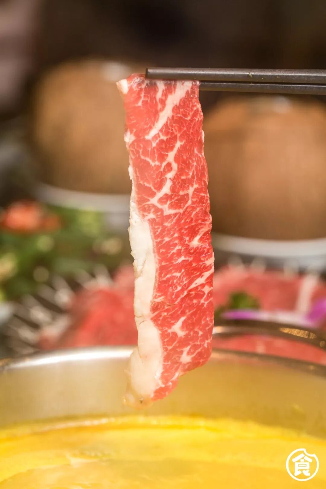 黑花的纹路勾起食欲,薄薄的肉片与咖喱锅更配