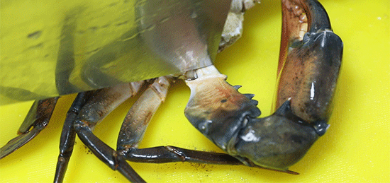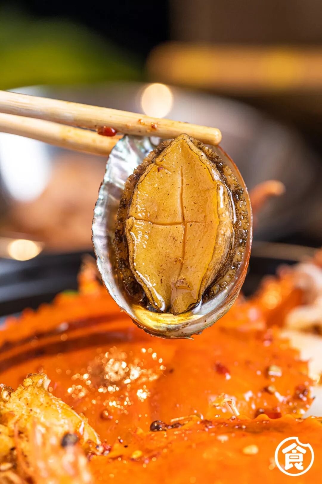 超级巨型身材的蟹,一个钳子就比我两只手指还要粗,还能轻松夹断筷子,拿的时候一定要让专业人士拿,迷宗蟹干锅炒的配料也是可以选择添加的。