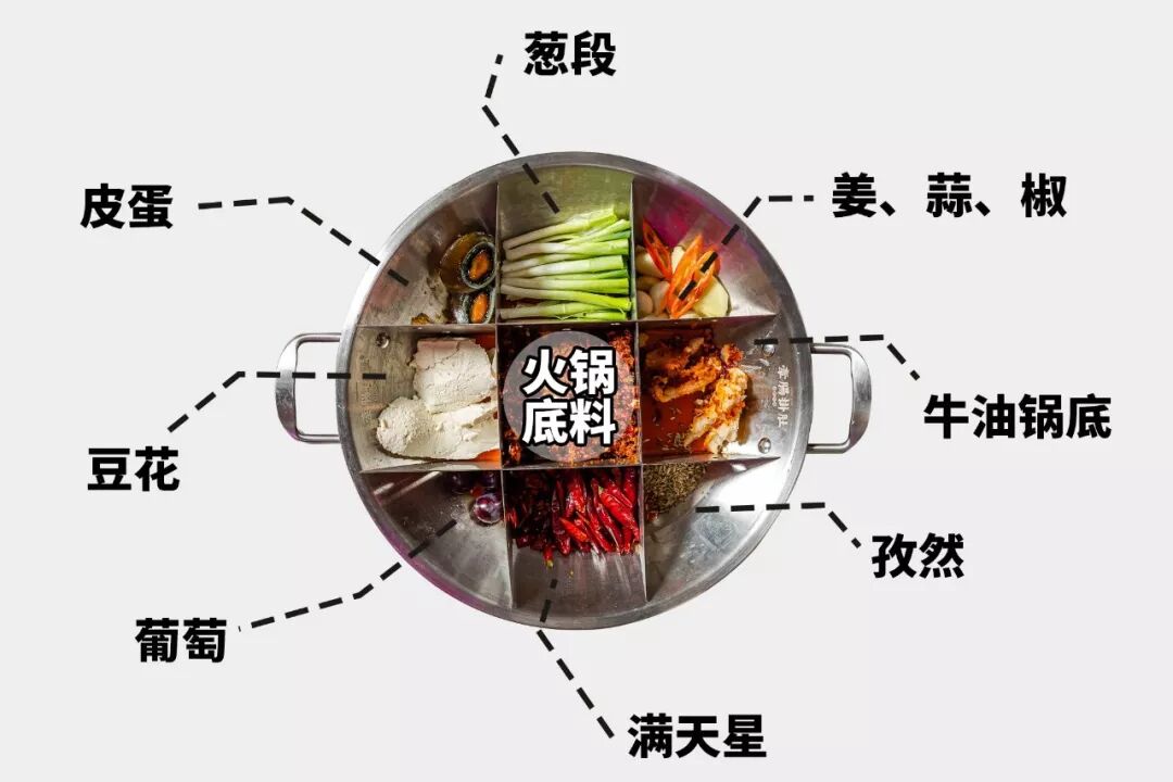 牵肠挂肚九宫格锅,底料就占了大半锅