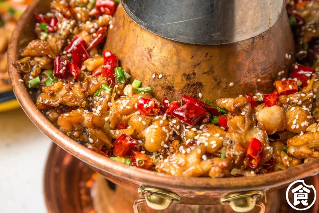 锅内的香辣牛蛙丰满紧致,金黄油亮