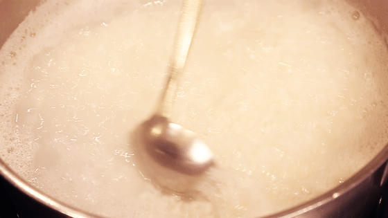 直到米浆熬成乳白色的锅底时