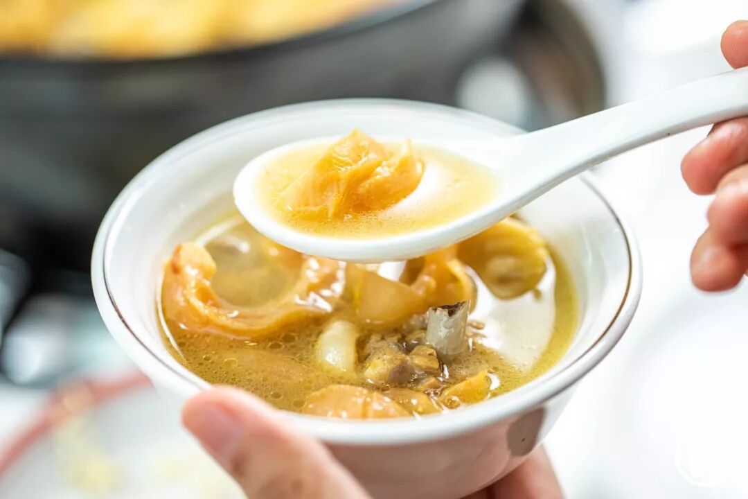 黄澄澄的鸡汤与花胶融为一体,胶原蛋白凝聚一锅,汤汁略带粘性,滋补养颜超级适合秋冬来一煲!