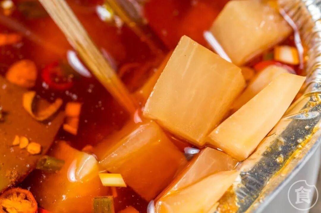 锡纸系列与别家不同的是,配上了秘制汤底。调料里特别加入了酸萝卜,加热中越来越入味,吃完主料,可别忘了碗底的它!
