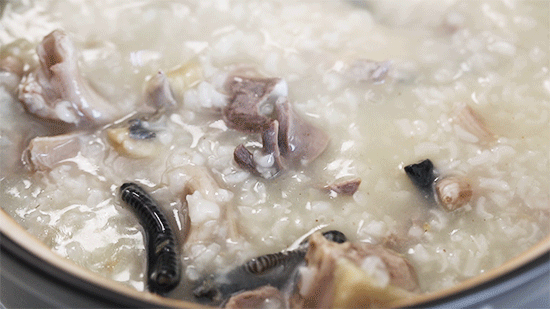 蛇肉、鸡肉等各种食材的精华全部融化于粥底之中,这锅粥真的不简单。