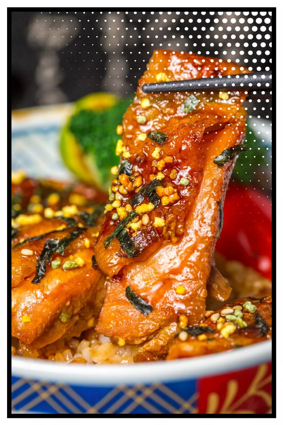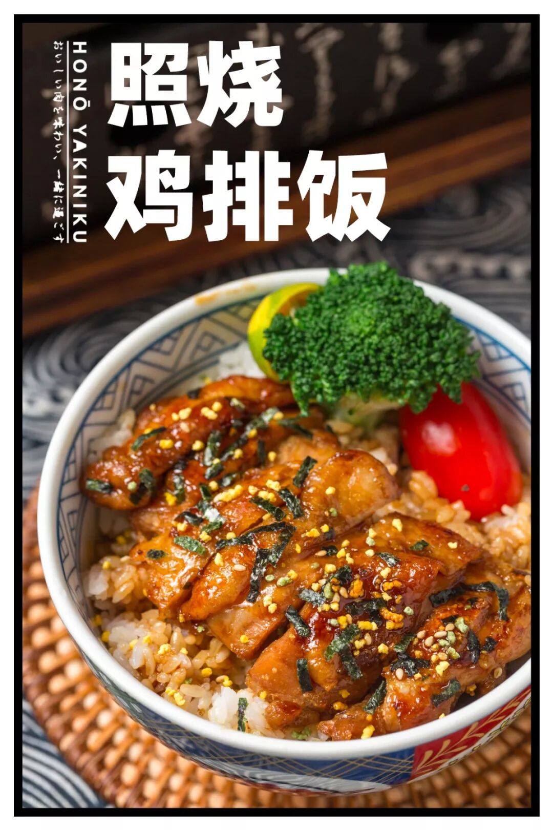 淋着照烧汁的鸡排,撒上白芝麻和紫菜