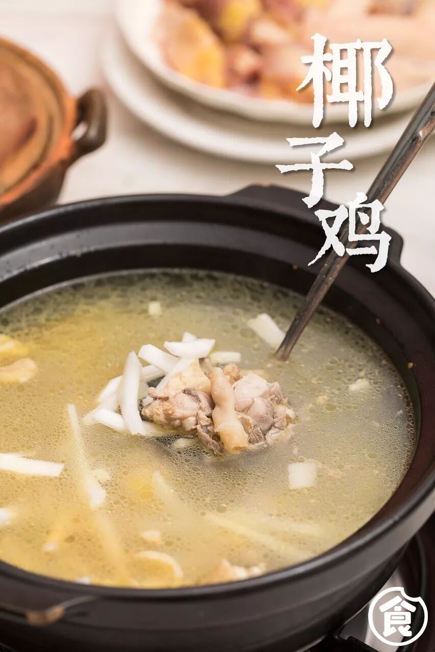 椰子鸡的汤底由椰青和老椰肉组成