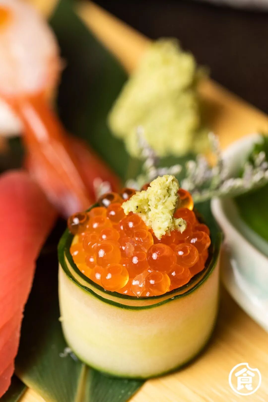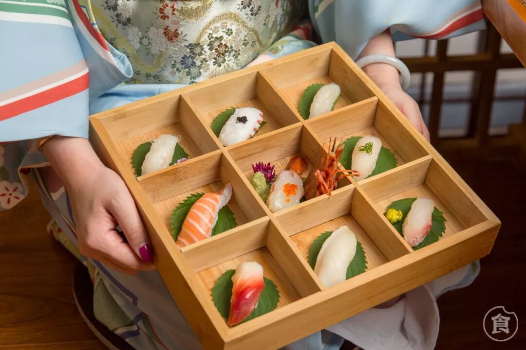 精致的九宫盒小木盒里躺着手握寿司