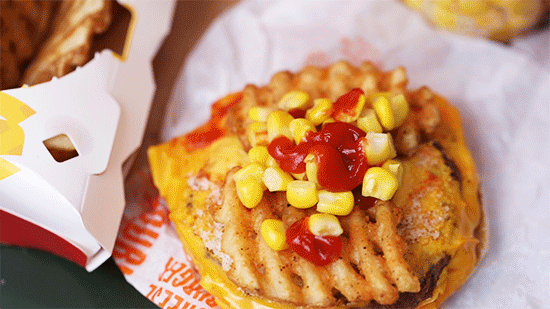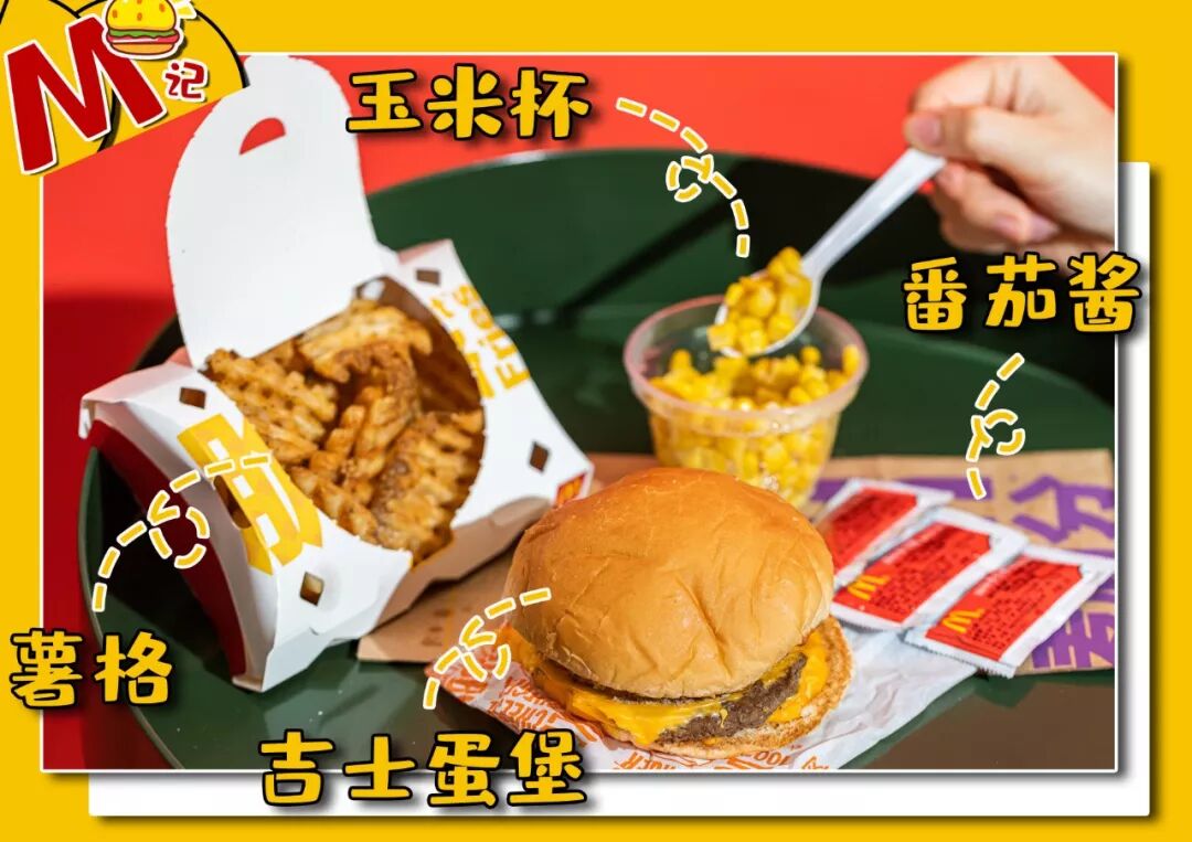 点单口令:吉士蛋堡1个、薯格1份(或者薯饼)、番茄酱1包,玉米杯1杯