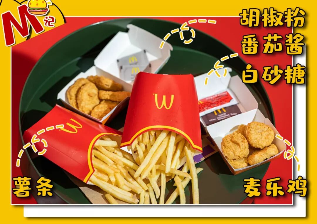 点单口令:2盒麦乐鸡、2盒无盐薯条、2包番茄酱、2包胡椒粉、1包糖、12号外卖袋