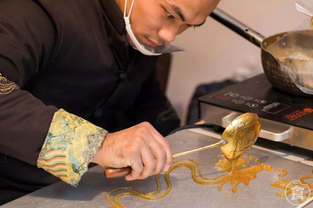 看着他舀起糖浆,运用腕力趁热一气呵成
