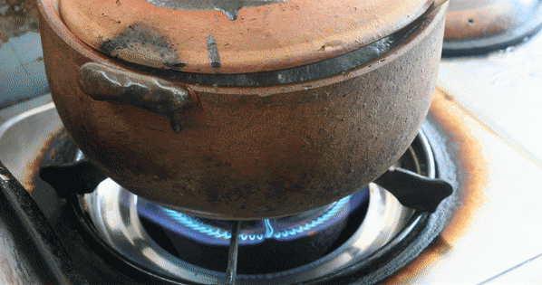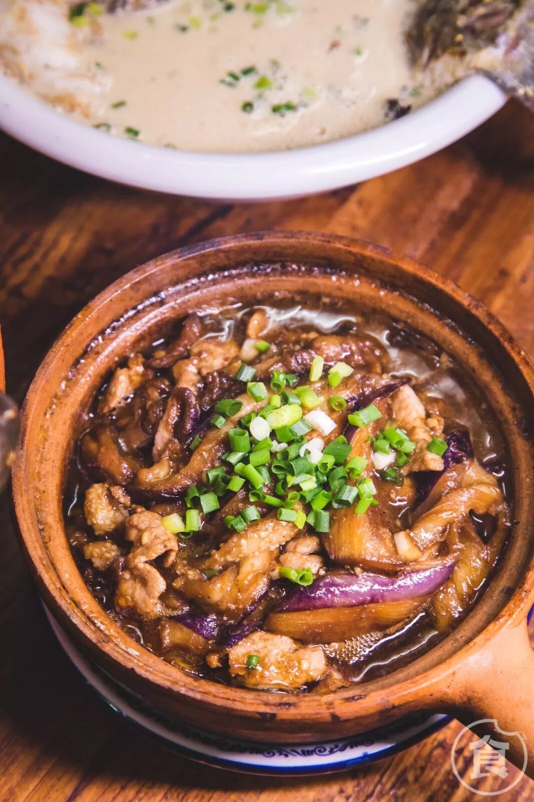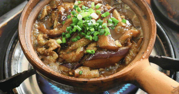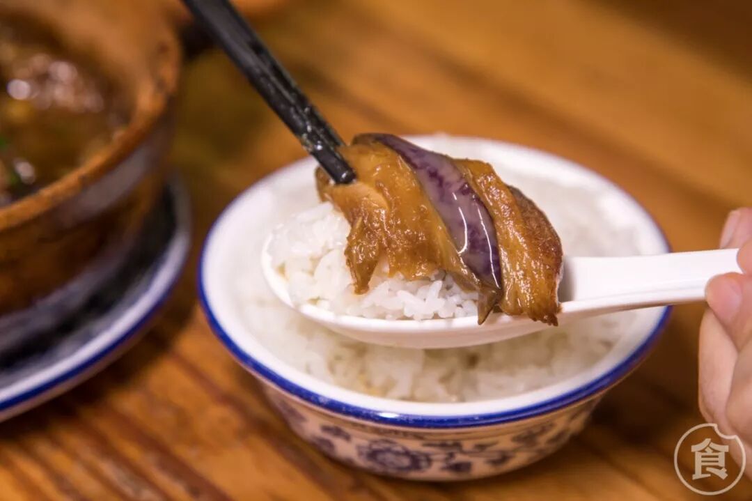 用每天新鲜买回的茄子做菜。先把它过一遍油,用马鲛鱼和肉末放入爆香,再在砂煲里焖煮一会儿。灶台上“璞噜璞噜”冒着热气的瞬间,香味更浓。
