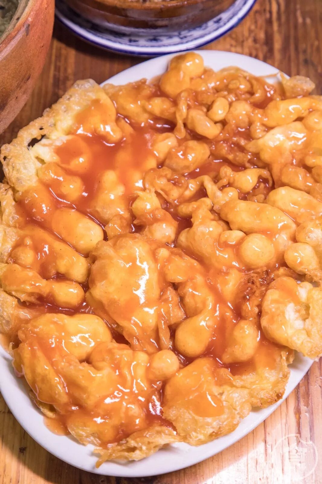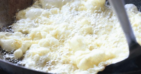 这是很考验掌勺人的一道菜。把蛋浆倒入热油中,期间不断转圈炸到蓬起就捞起沥干。刚出锅的时候,颜色金黄特别好看。